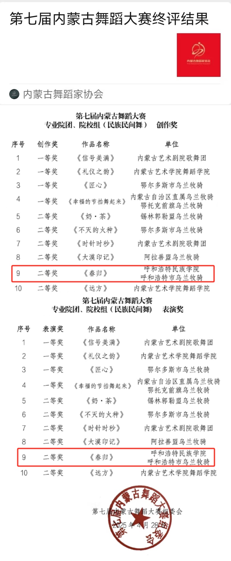 近日,内蒙古舞蹈家协会官方公众平台公布了由内蒙古自治区文学艺术界联合会主办,内蒙古舞蹈家协会承办,内蒙古自治区直属乌兰牧骑和内蒙古自治区文化馆协办的第七届内蒙古舞蹈大赛终评结果。我院舞蹈学专业首部原创舞蹈作品《春归》获专业院团、院校组(民族民间舞)创作类二等奖、表演类二等奖。该作品作为舞蹈学专业自2021年成立以来首个在省级赛事中入围并获奖的作品,标志着我院舞蹈学专业建设的历史性突破。